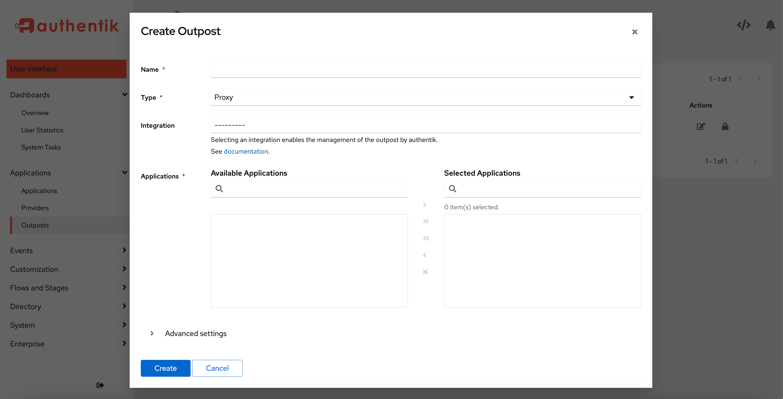 - Navigate to Applications > Outposts and then click Create.
